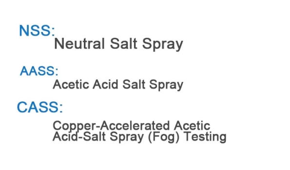 | CASS | Copper Accelerated Salt Spray | ~3.0 | Coating durability under acidic, copper-rich fog |